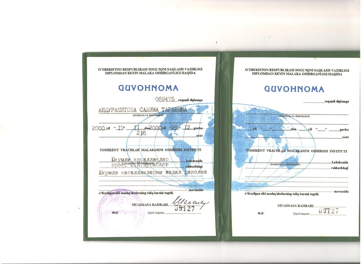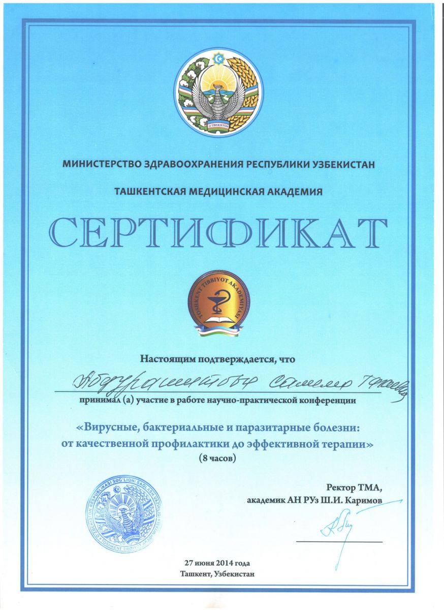 - 2015 г. – сертификат «Хронические Вирусные гепатиты В, С, D»;