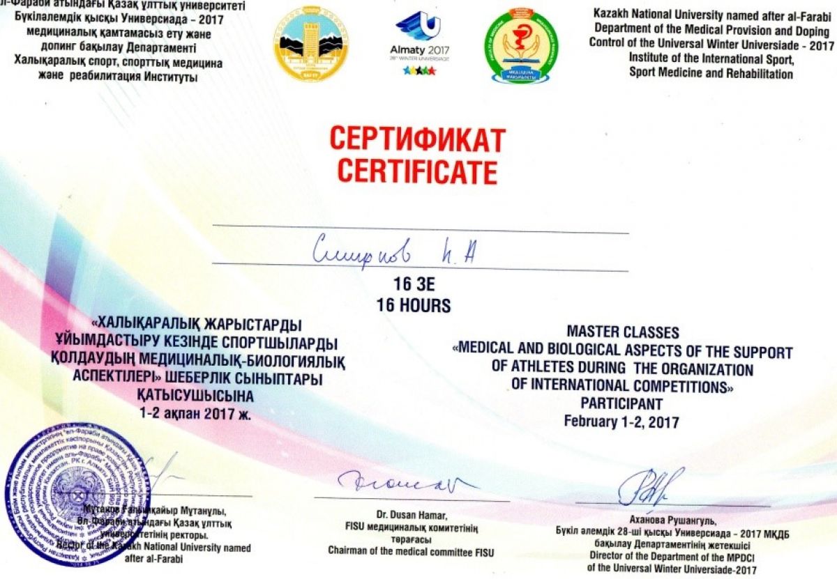 2012г. КазНМУ им.Асфендиярова, Интернатура по специальности: «Врач общей практики»
