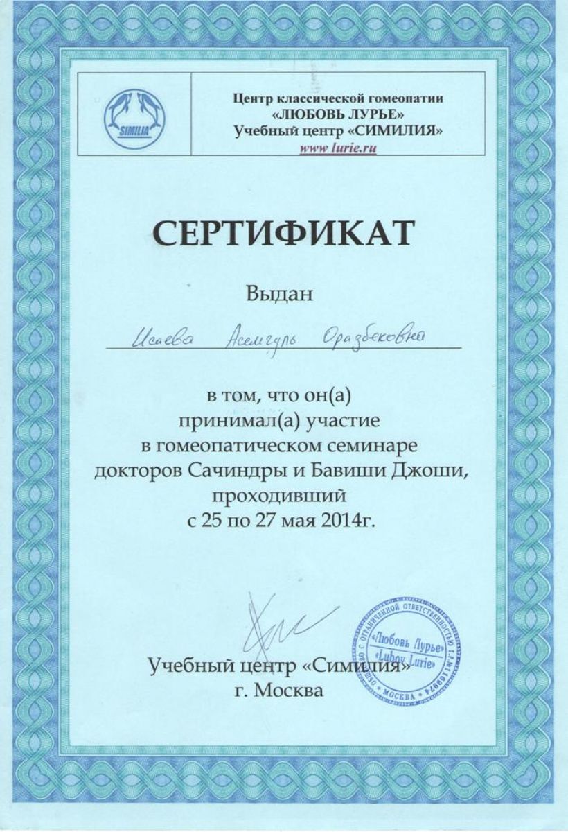 • 1996 г. – повышение квалификации «Врач-гомеопат».