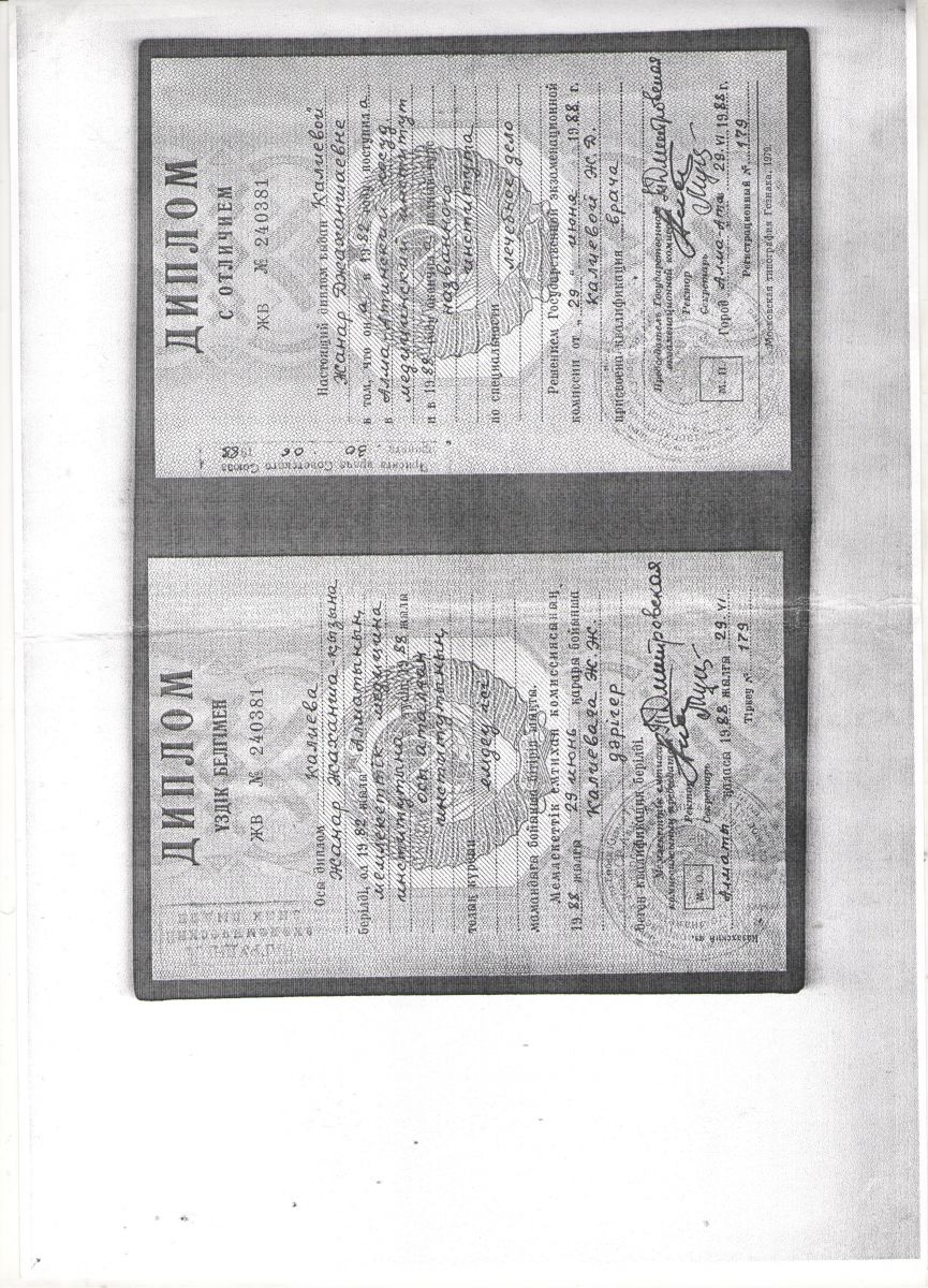 1982 -1988 гг. Алматинский государственный медицинский институт. Лечебный факультет, диплом с отличием.