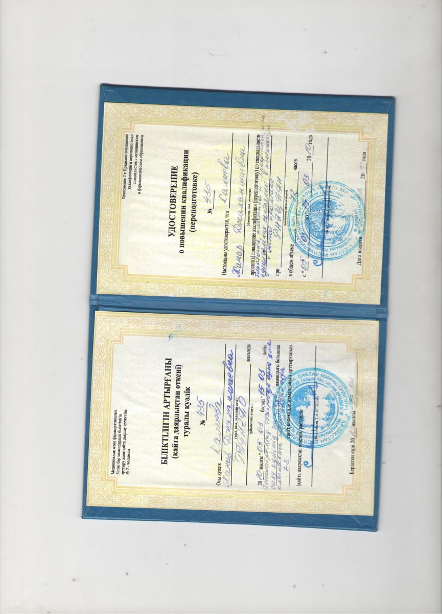 2015г. Казахском медицинском институте непрерывного образования по циклу « Преподаватель медицинских организации и науки».