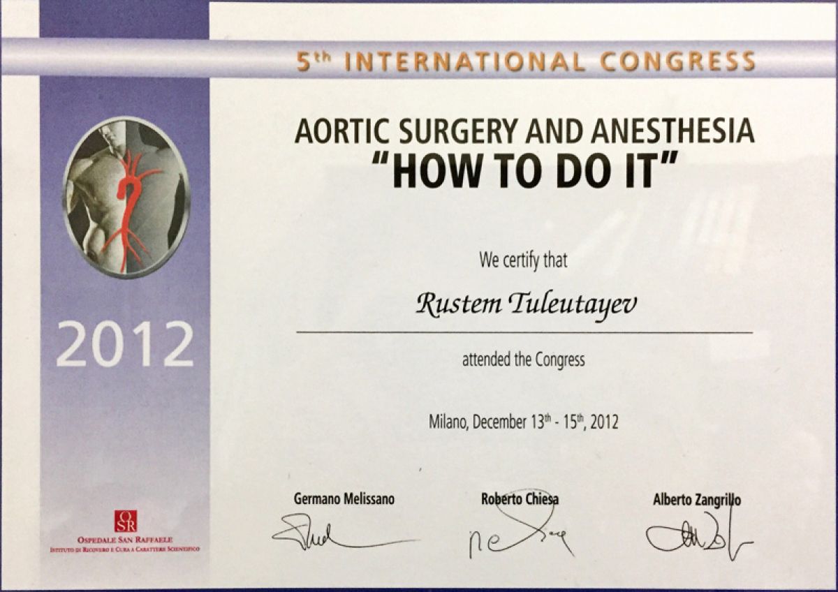 - 2012 ж. – аортаның көтерілу бөлімі мен доғасын хирургиялық емдеу бойынша жетілдіру курсы «How to do it» (Милан, Италия);