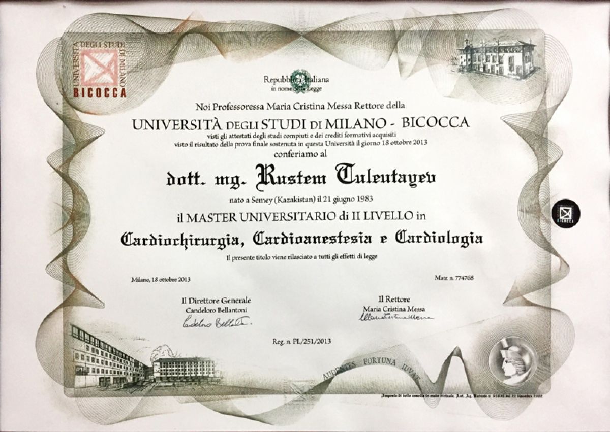 - 2012-2013 жж. – University Milano – Bicocca (Милан, Италия), кардиохирургия, кардиология, кардиоанестезиология бойынша магистратура.
