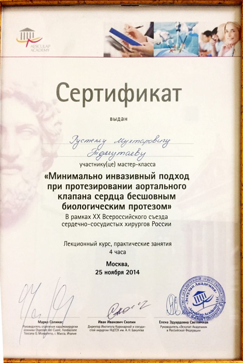 - 2014 ж. – аорталық клапанның минималды инвазивті хирургиясы бойынша курстар (Москва, РФ);